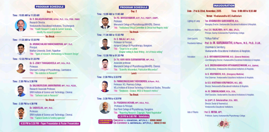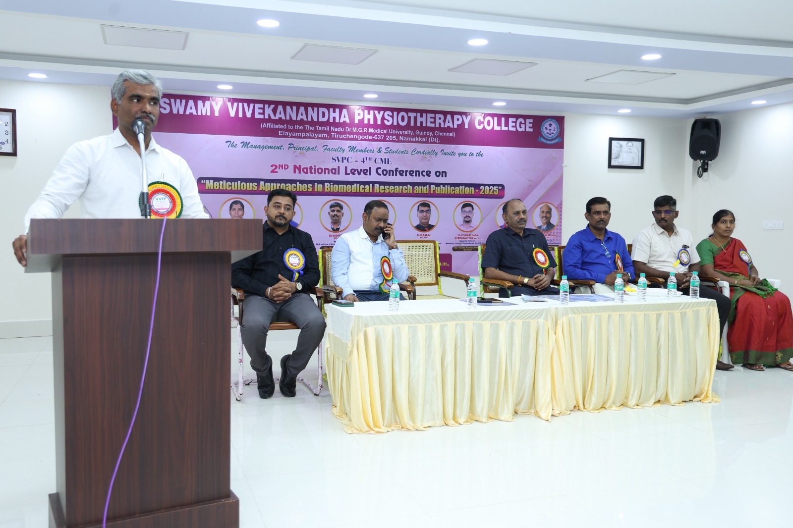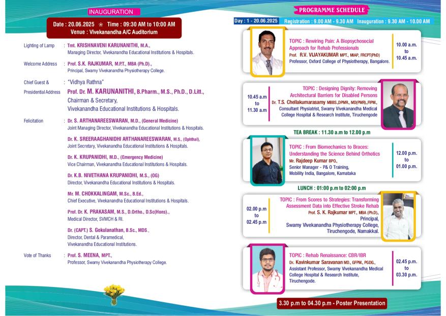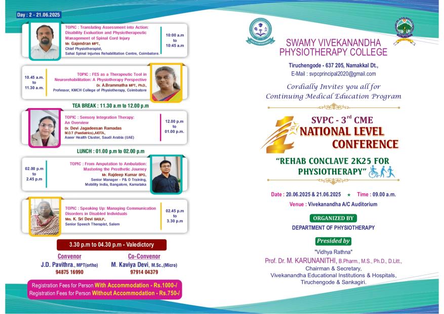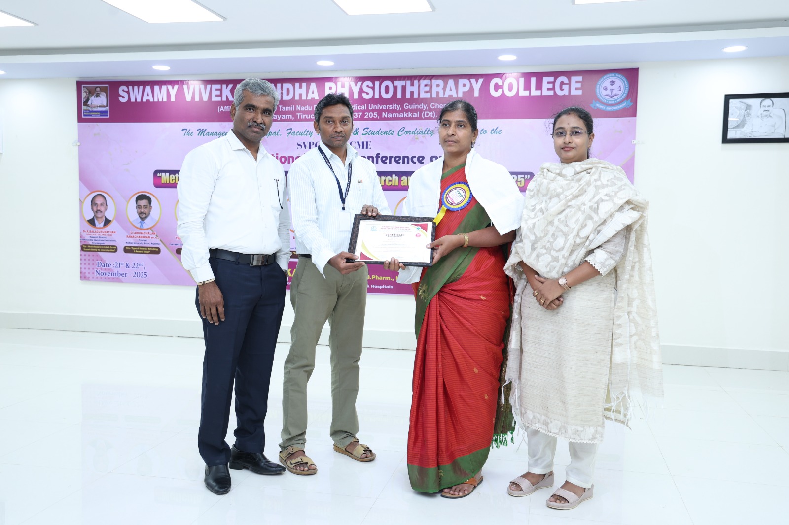 Ms. Farhana, from Swamy Vivekanandha Physiotherapy College, Namakkal District, has secured Second Place 🥈 in the Poster Presentation at the National Conference organized by the Tamil Nadu Government Physiotherapy Association on 28.09.2025, held at The Tamil Nadu Dr. M.G.R. Medical University, Chennai.